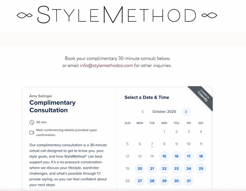 Book a virtual consultation with StyleMethod® today and transform your wardrobe into a curated, effortless, and stylish collection.